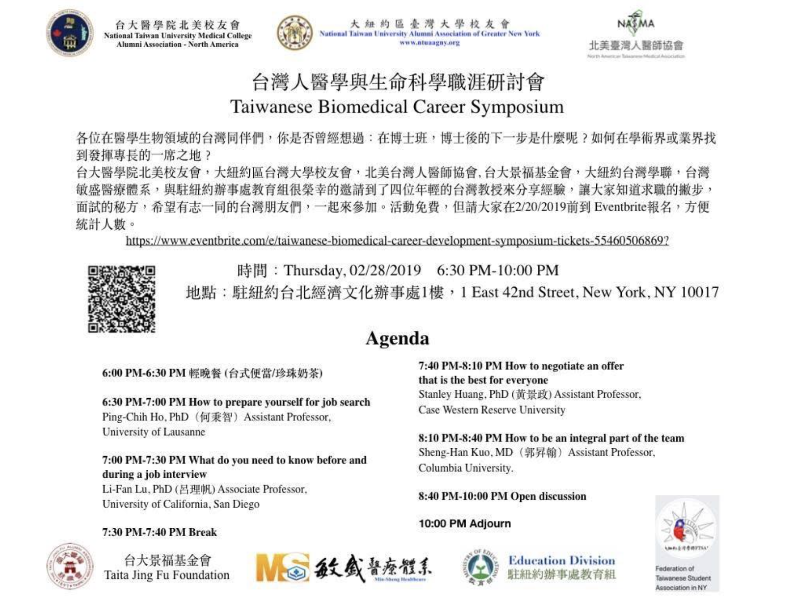 2019-02-28 [NY/NJ/CT Chapter 紐約分會] 2019 Taiwanese Biomedical Symposium February 28, 2019 6:30p-10:00p NY TECO 1 East 42nd St. New York, NY 10017